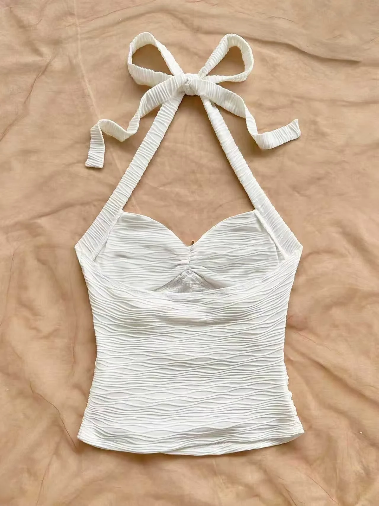The backless design adds a sexy twist to this otherwise classic top, making it a standout piece in any wardrobe.